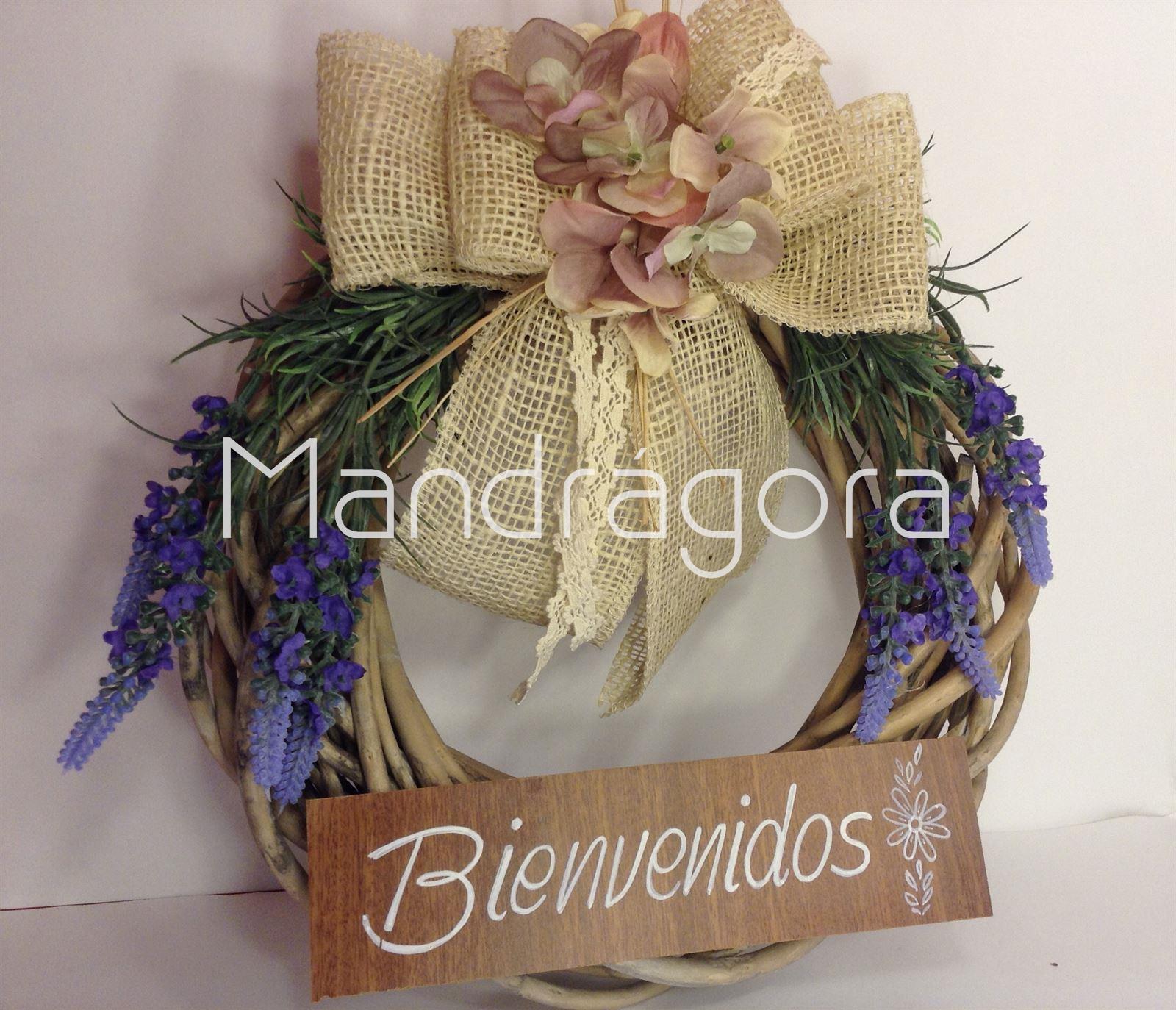 corona decorativa para puerta realizada con flor artificial con mensaje de benvidos